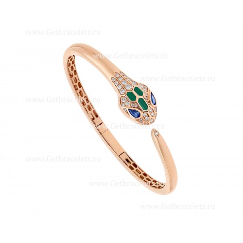 Bvlgari Serpenti 18 karátos rozéarany karkötő kék zafír szemekkel, malachit elemekkel és pave gyémántokkal