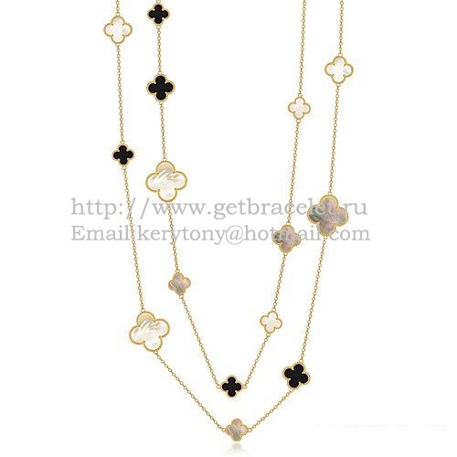 Van Cleef Arpels Magic Alhambra nyaklánc sárgaarany 16 motívummal és fekete agáttal, fehér és szürke gyöngyház díszítéssel